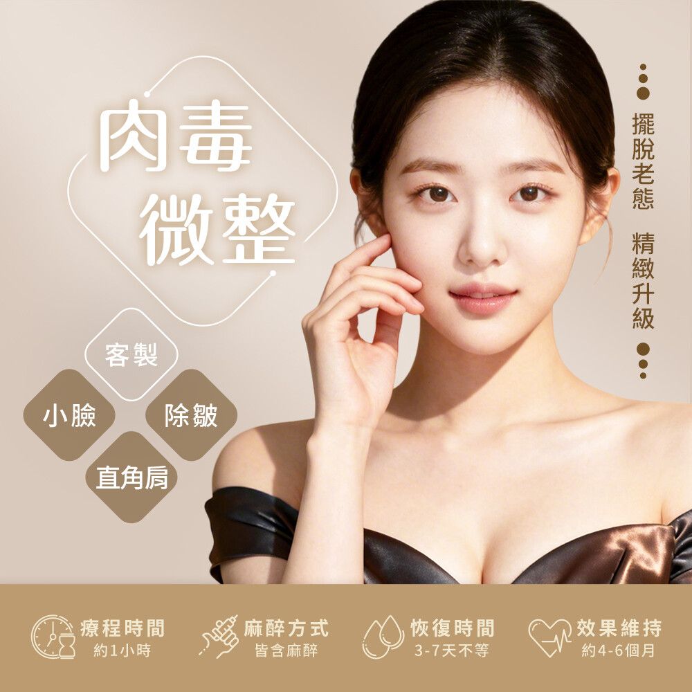 肉毒微整|除皺、小臉 想改善皺紋、修飾方圓臉,連肩頸線條也一起升級? 肉毒療程一次鎖定多種常見外觀困擾,從紋路、臉型到斜方肌厚實感,都能做更自然的修飾。讓妳從臉到肩頸都更顯輕盈,整體視覺更年輕、更上相,精緻感自然看得見。 了解更多